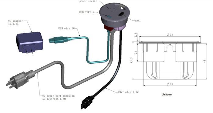 Our 64 mm (2 1/2”) diameter, black grommet features a built-in power socket and a port and cable for USB and HDMI.