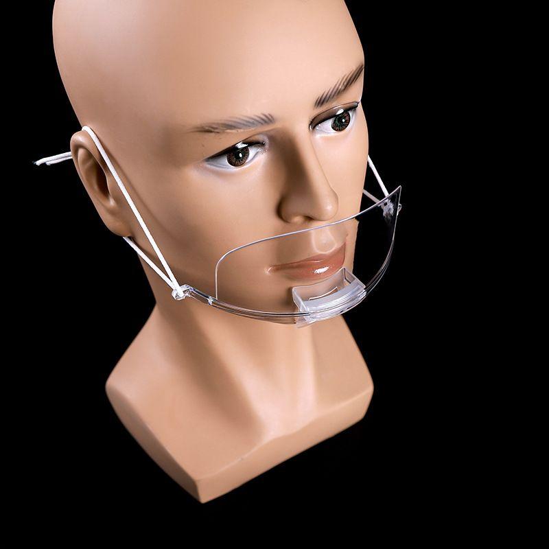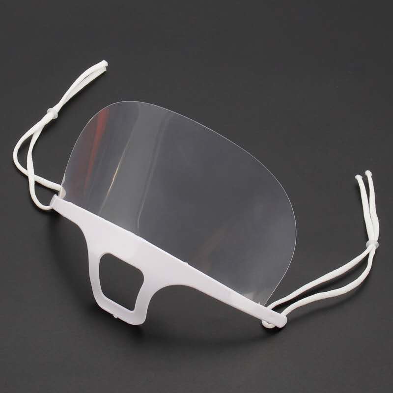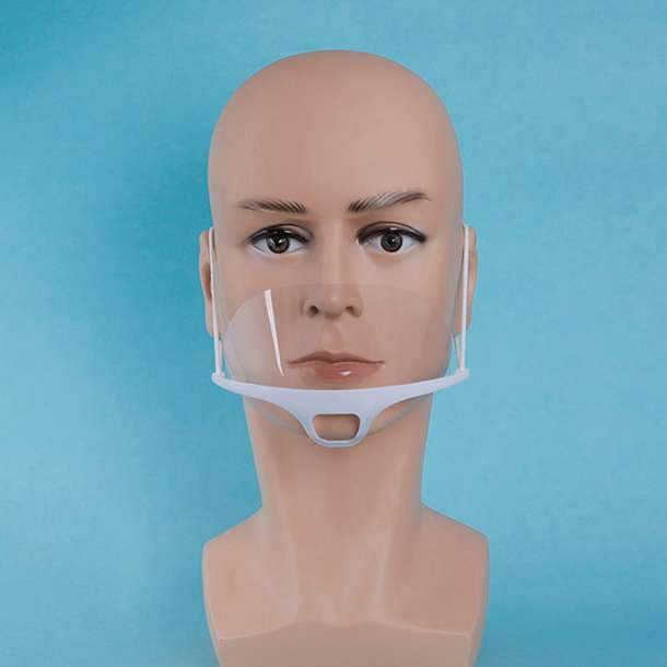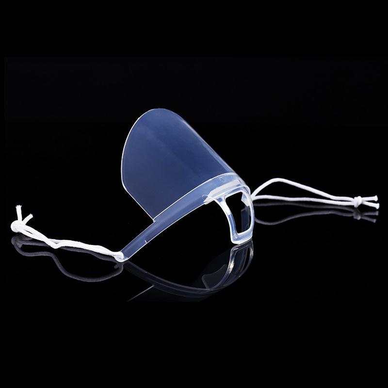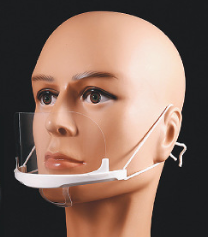 This mouth shield rests on the chin and protects the lower half of the face. It is attached by a string which can be knotted or tied and looped over the ear.